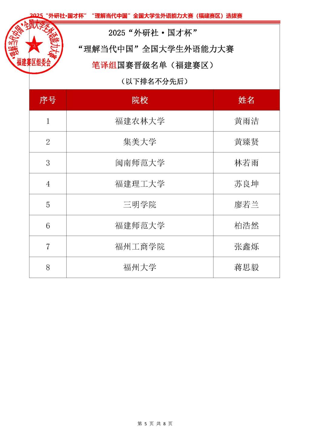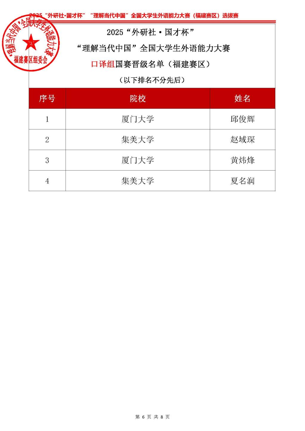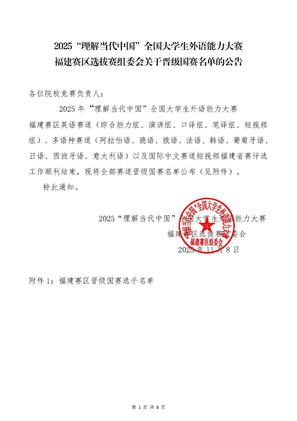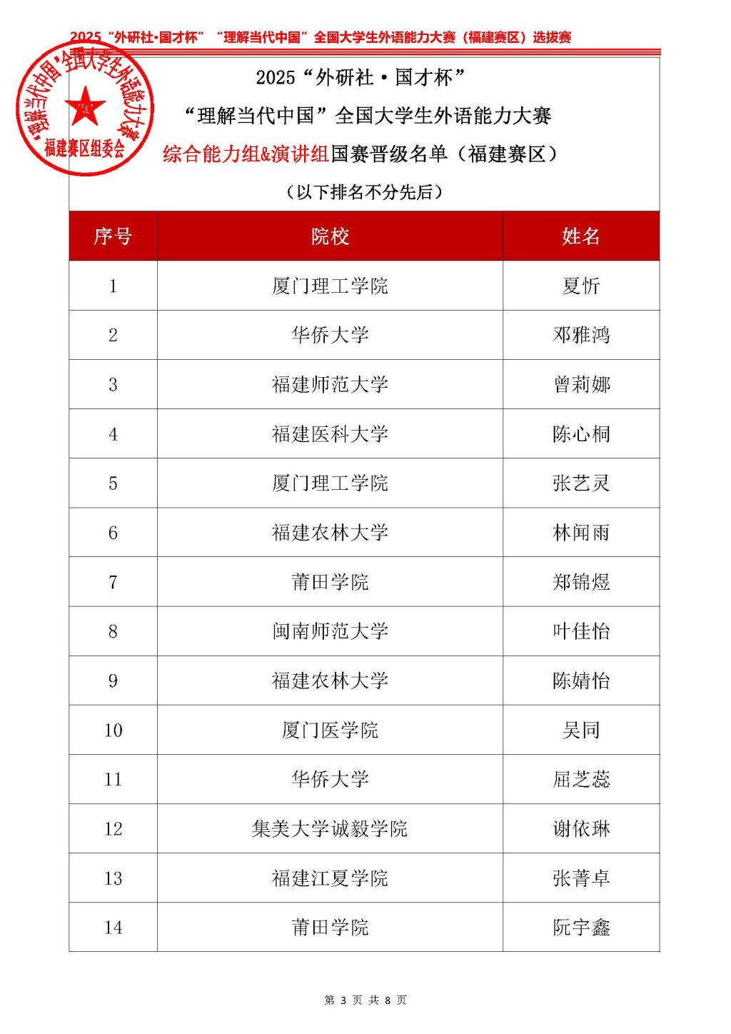 2025“理解当代中国”全国大学生外语能力大赛福建赛区选拔赛组委会关于晋级国赛名单的公告