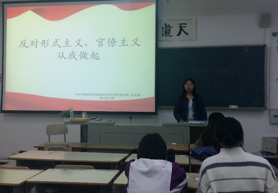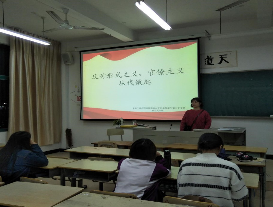 进入十一月以来,中共语言与文化学院学生第二党支部各党小组相继开展以“反对形式主义、官僚主义从我做起”为主题的讨论会和学习《中华人民共和国保守国家秘密法》的党日活动,各党小组成员积极参加。