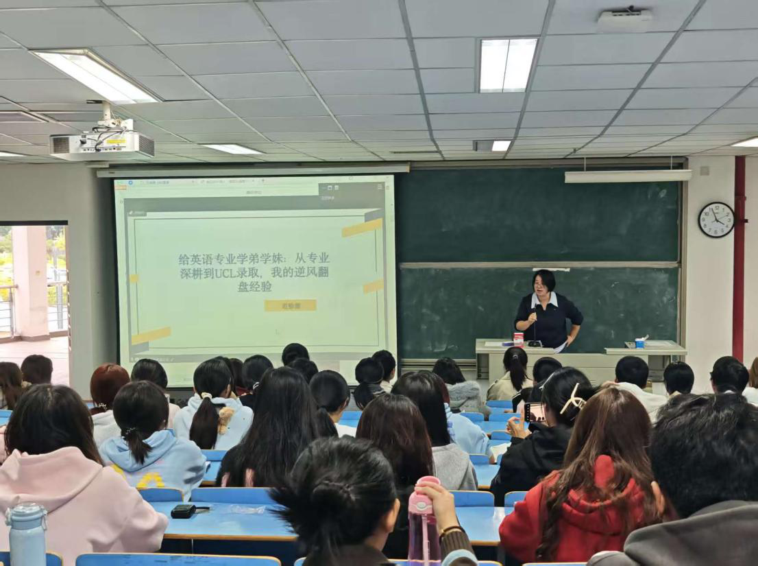为落实卓越拔尖人才培养计划,助力英语专业学子明确成长路径、提升综合素养,11月11日下午4时,语言文化学院举办《英语专业学生如何做好学业职业规划:从专业深耕到UCL录取,我的逆风翻盘经验》专题讲座。讲座由英语系主任游灼梅老师主持,2025届全体学生及卓越班学生参加。英语系2025届英语专业优秀毕业生范徐源结合自身成长经历,为学弟学妹们解锁英语专业的深耕之道与职业航向。