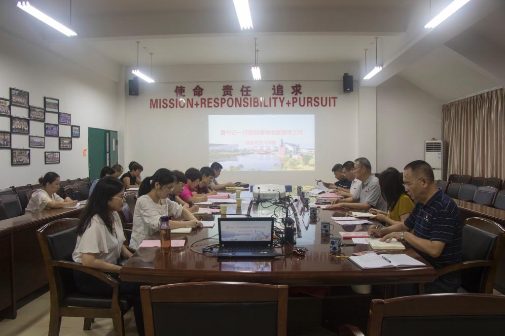 2019年9月3日下午,校党委书记夏良玉、党委副书记徐晓丹,党政办主任高春晗、宣传部部长赵公弼、学工处处长毛茂峰等一行莅临我院开展维稳及新学期准备工作调研。校党委书记夏良玉一行现场察看了党支部书记教师工作室项目建设情况,检查了学院周边环境及教学设施准备,并召开座谈会,详细询问了语院师生返校及思想动态、教学、迎新等工作的准备情况等。强调指出,新学年新学期要把安全稳定工作摆在首位,针对苗头性的问题要抓准抓早,事关师生安全和利益的事要即知即改,尽快稳妥处置,积极作为,维护好当前校园安定和谐局面。