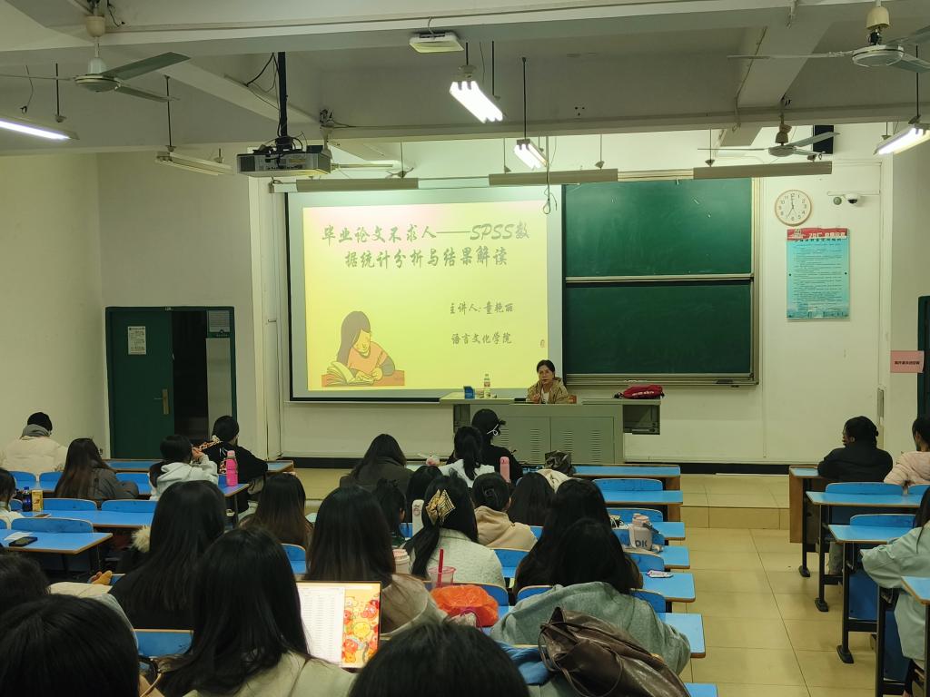 为助力学生攻克毕业论文数据处理难题,提升论文写作质量与效率,培养学术研究思维和能力,2025年11月28日,英语系在求知楼AA201开设“毕业论文不求人——SPSS数据统计分析与结果解读”专题讲座,语言文化学院副教授童艳丽老师主讲,22级英语专业全体学生、23级英语专业卓越班学生参加。